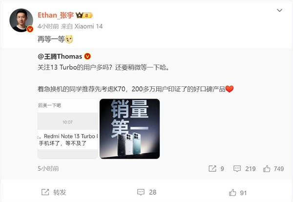 In this regard, Wang Teng said that Redmi Note 13 Turbo will have to wait a little, and students who are in a hurry to change the machine can consider Redmi K70.