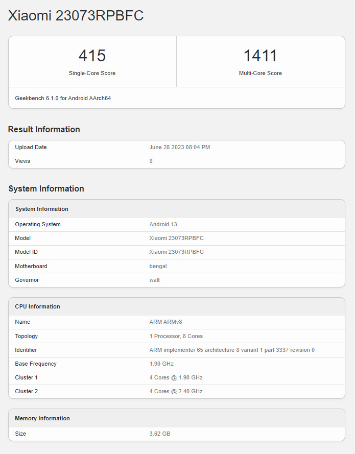 Redmi Pad 2 recently appeared in GeekBench 6.1.0 run library, its model is 23073RPBFC, single-core score is 415 points, multi-core score is 1411 points.