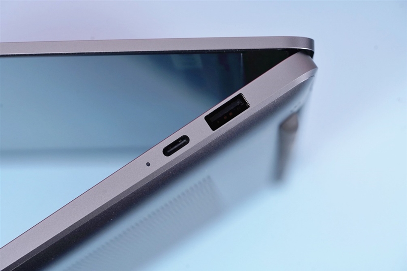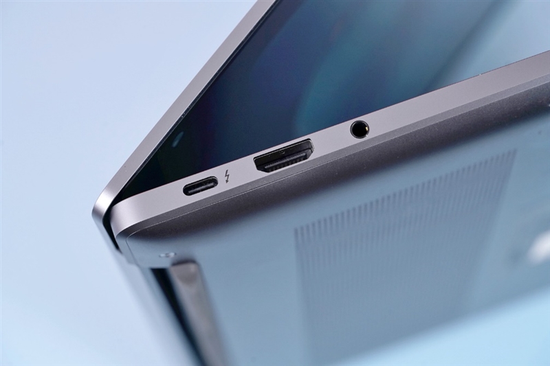 On the left side of the laptop are Thunderbolt 4, HDMI 2.0, and 3.5mm audio output and input two-in-one jacks. On the right are the USB-C 3.2 Gen1 and USB-A 3.2 Gen1 interfaces. There is a large area of mesh metal heat dissipation grid on the D side, as well as a lengthened foot pad, which avoids the problem of poor heat dissipation when it is flat on the desktop.