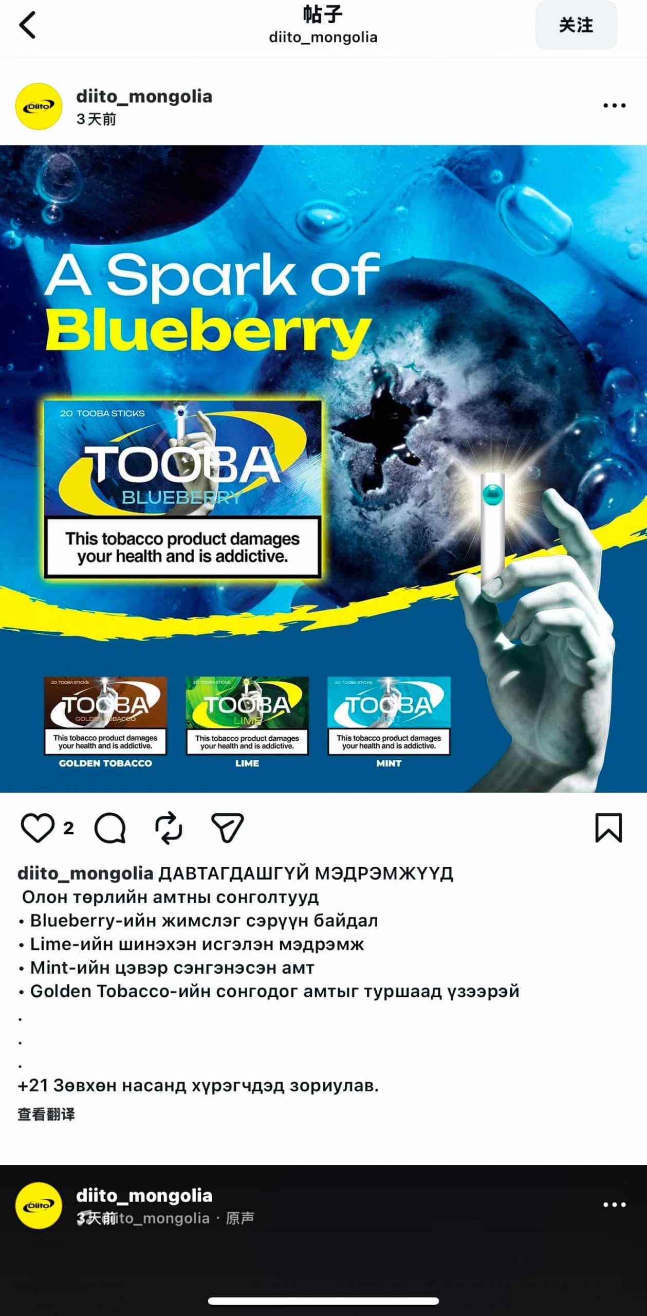 A social media user named “Diito Mongolia Exclusive Distributor” (Diito Mongolian Exclusive Dealer) posted a series of promotional information about the new heating tobacco device “DIITO” and the accompanying cartridge “TOOBA”.