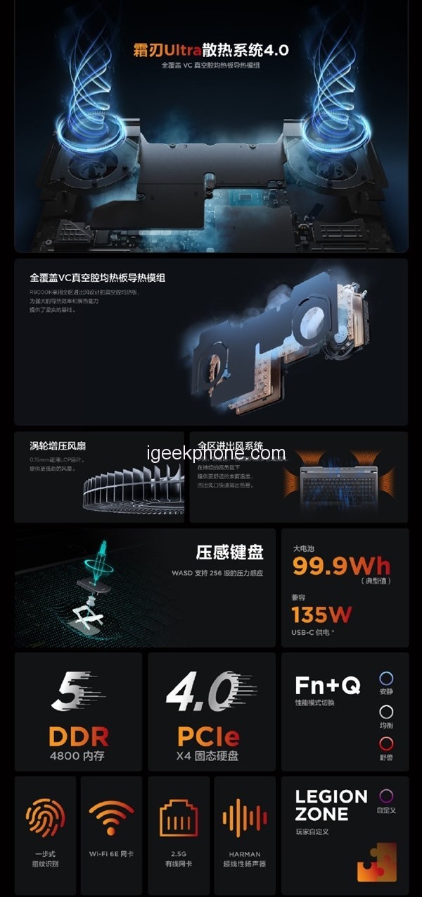 In other respects, the notebook is equipped with a WASD pressure-sensitive keyboard, fingerprint recognition, a 99.9Wh battery, supports 135W charging, and 100W PD charging. Interfaces include a 2.5G network port, USB-4 interface, HDMI interface, etc.