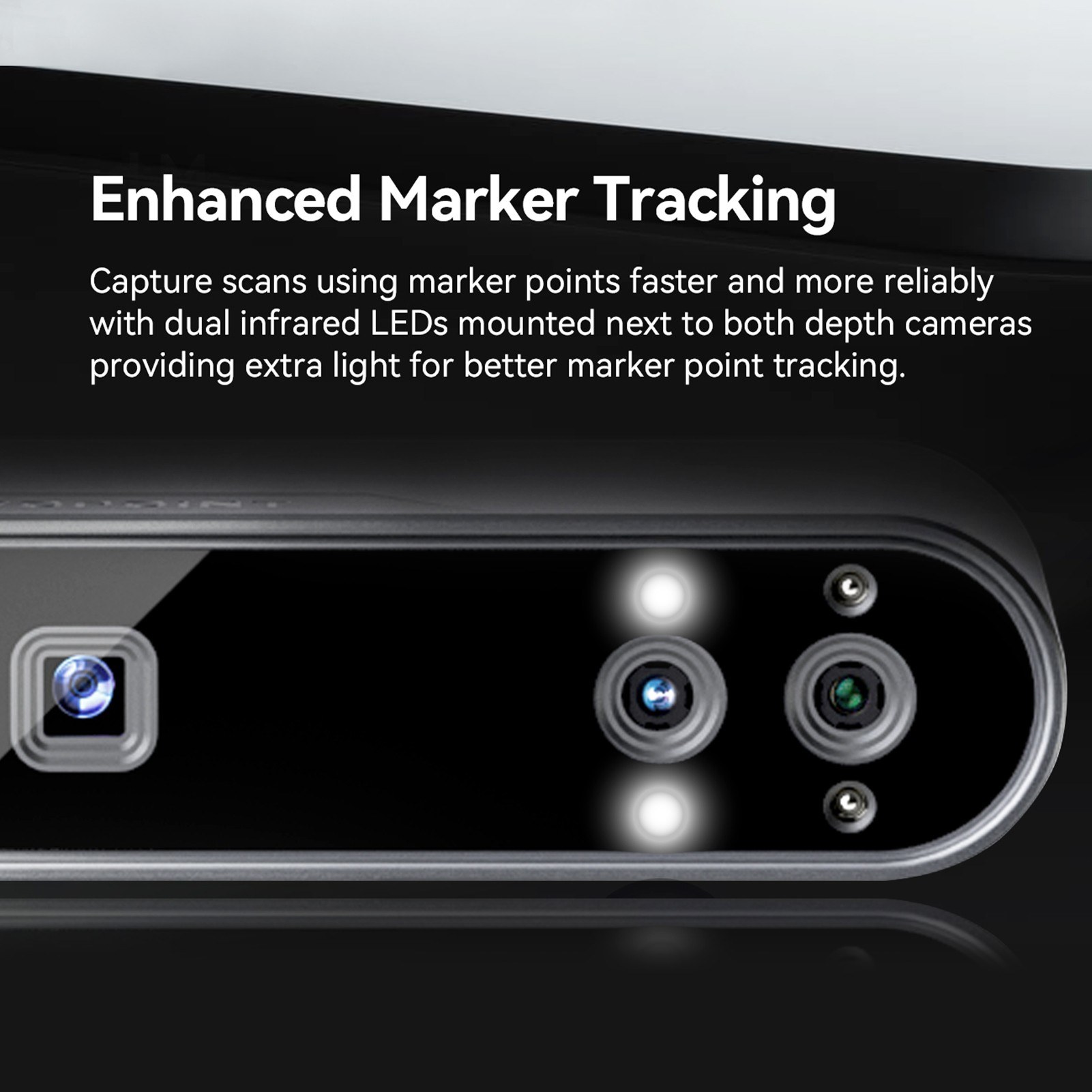 The Revopoint POP 3 3D Scanner embodies a sleek and ergonomic design, complemented by a robust build that exudes durability. Its incorporation of an Inertial Measurement Unit (IMU) and two powerful infrared LEDs reflects its commitment to ensuring superior precision and stable marker tracking. The strategically positioned RGB camera, equipped with a 20% larger aperture; works in tandem with dual white LEDs to eliminate shadows and enhance color scanning. Notably, the incorporation of three touch-sensitive buttons facilitates effortless control, allowing users to seamlessly maneuver through the scanning process with ease.