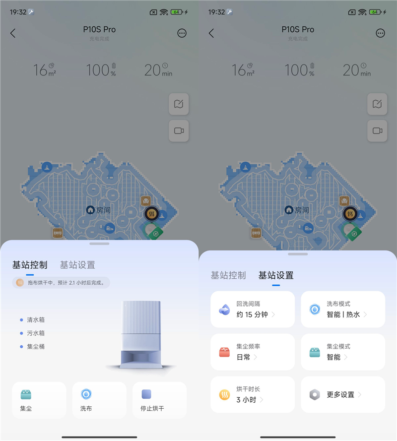 After completing cleaning, the P10S Pro autonomously assesses the dirt level and intelligently washes, requiring no user intervention. Throughout this process, the base’s bottom plate continuously emits 45-degree hot air (optionally up to 60 degrees) for a default drying time of 3 hours.