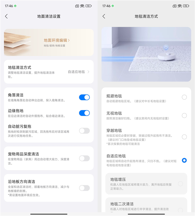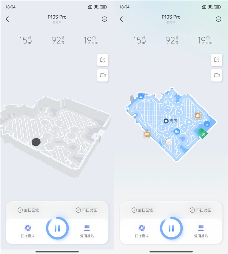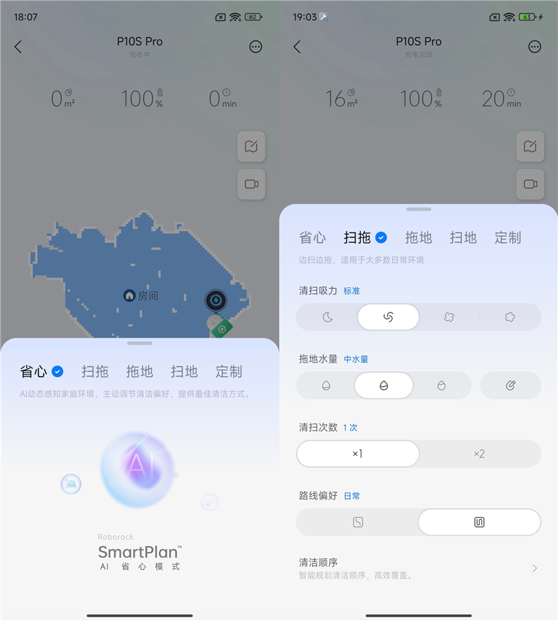 It intelligently identifies room types, floor materials, and more, generating cleaning parameters and planning the sequence, adjusting suction, water volume, and route preference. On the flip side, sweeping, mopping, sweeping, and customizing modes on the P10 Pro need manual settings for the desired cleaning effect.
