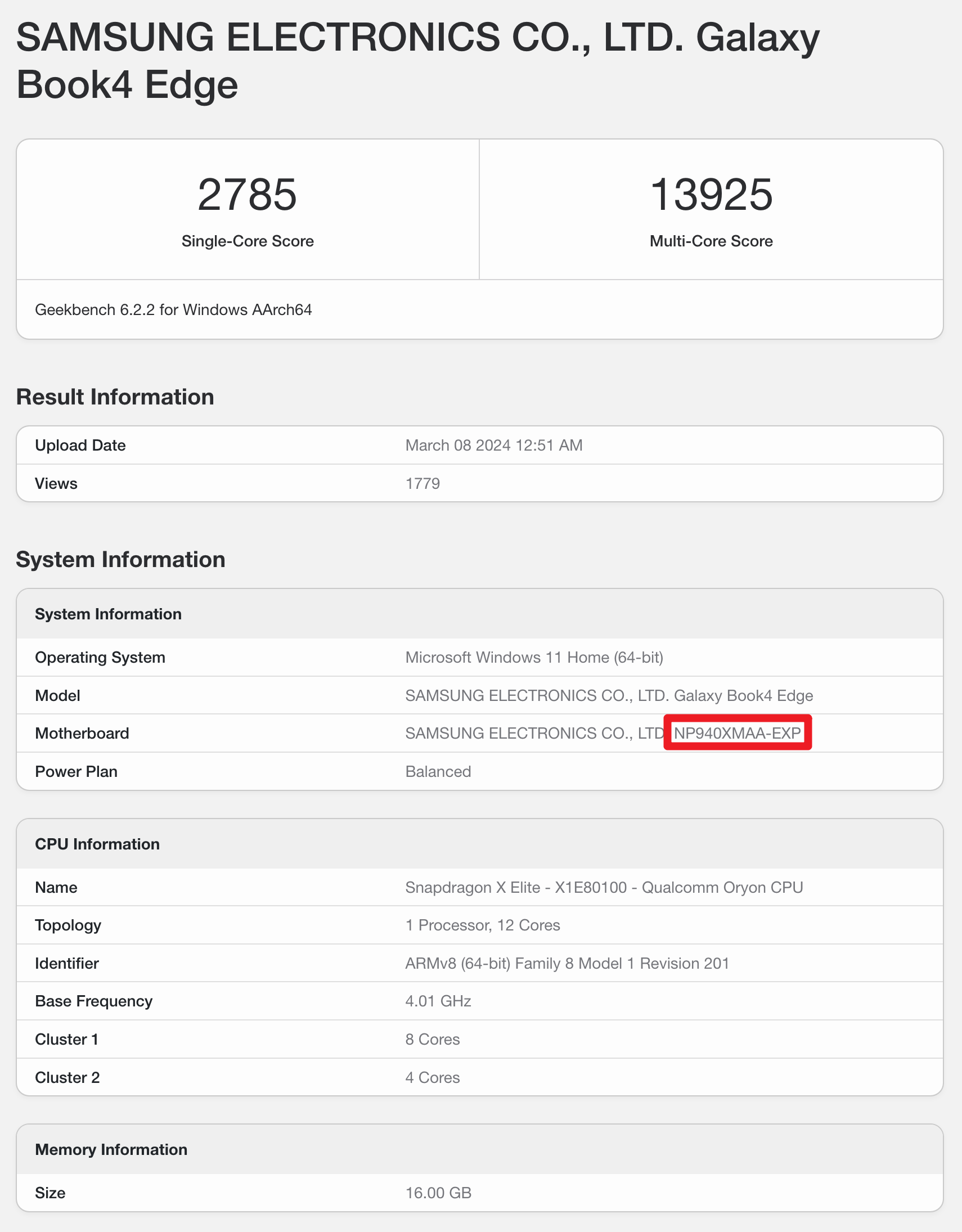 Igeekphone previously reported that the Galaxy Book4 Edge laptop has appeared in the Geekbench scoring database, the test model number is NP940XMAA-EXP, equipped with Snapdragon X Elite X1E-80-100 processor.