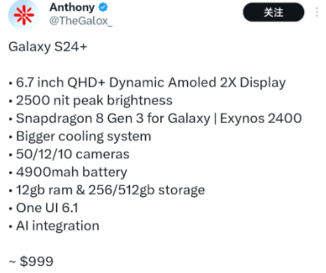 It is expected to have a 6.7-inch QHD+ AMOLED display with a 2500nit brightness and a Snapdragon 8 Gen 3 for Galaxy or Exynos 2400 processor. The rear three cameras are 50 million pixels, 12 million pixels and 10 million pixels respectively, equipped with 4,900mah battery, 12GB RAM and 256GB / 512GB storage space, and equipped with One UI 6.1 system. In addition, the blogger predicted that the Samsung Galaxy S24 + phone will be priced at $999 (IT home note: the current about 7293 yuan).