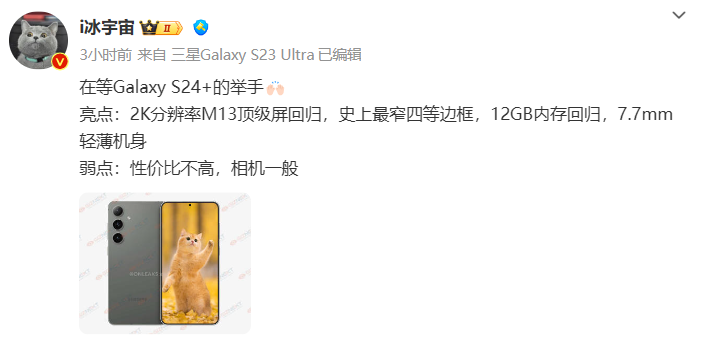 According to blogger @iice Universe, Samsung Galaxy S24 + mobile phone will use 2K resolution M13 top screen, said to have the “narrowest fourth class border in history”, provide 12GB memory and 7.7mm thin body. For the shortcomings of this product, the blogger bluntly said that its “cost-effective is not high, the camera is general.”