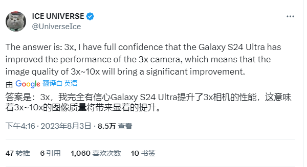 However, the news source @iice Universe tweeted yesterday that the Galaxy S24 Ultra will continue to use the 3x telephoto lens, but with the help of software and algorithms, it will bring major improvements.