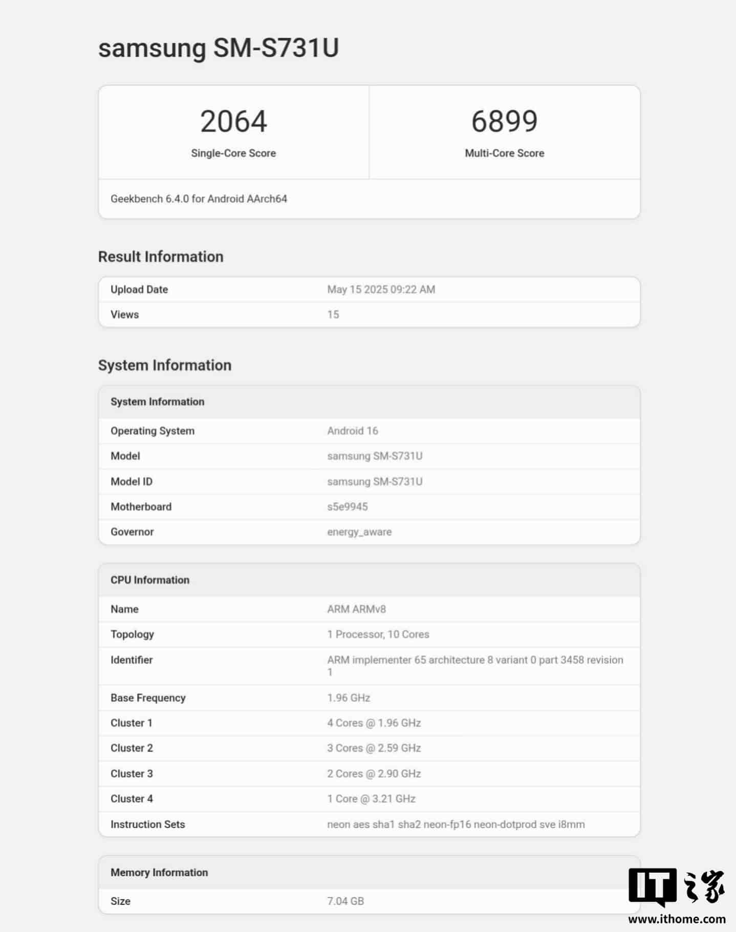 The Samsung Galaxy S25 FE mobile phone has previously appeared in the GeekBench benchmark library, equipped with an Exynos 2400 processor, 8GB of memory and the Android 16 operating system.