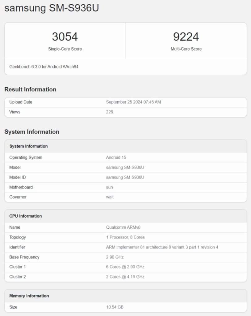 Igeekphone, September 27 news, technology media sammyguru published a blog post today (September 27), reporting that Samsung Galaxy S25 Plus mobile phone appeared in the GeekBench running library, Equipped with Qualcomm Snapdragon 8 Gen 4 (some news says it may be called Snapdragon Elite) chip, the 6.3.0 version has a single-core score of 3054 points and a multi-core score of 9224 points.