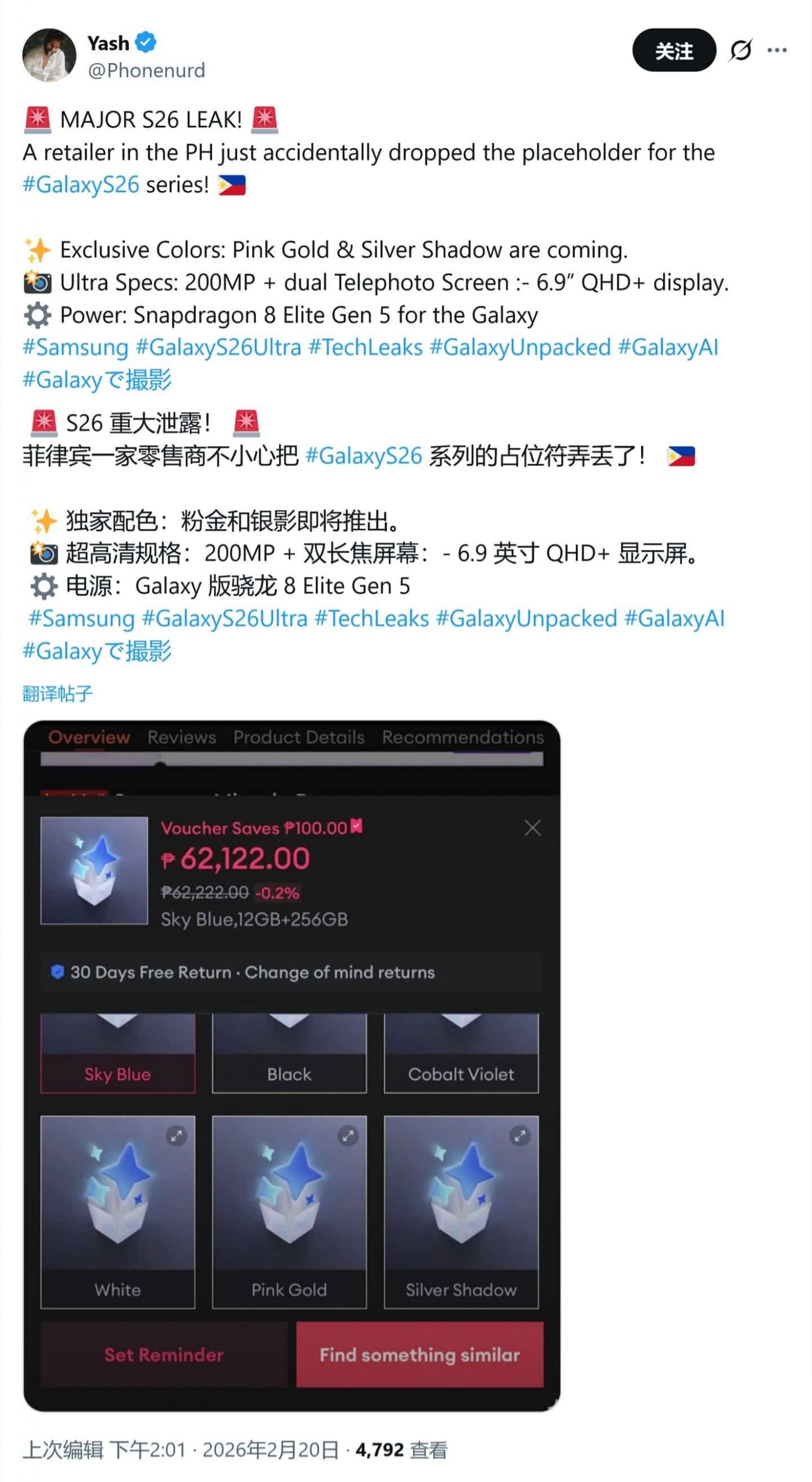 Igeekphone reported on February 21st that the source @Phonenard posted a tweet on the X platform yesterday (February 20th), revealing that a Philippine e-commerce platform had already put the Samsung Galaxy S26 series products on sale in advance. The tweet also showed that there were a total of 6 colors for this series, and 2 of them were exclusive colors for online sales.