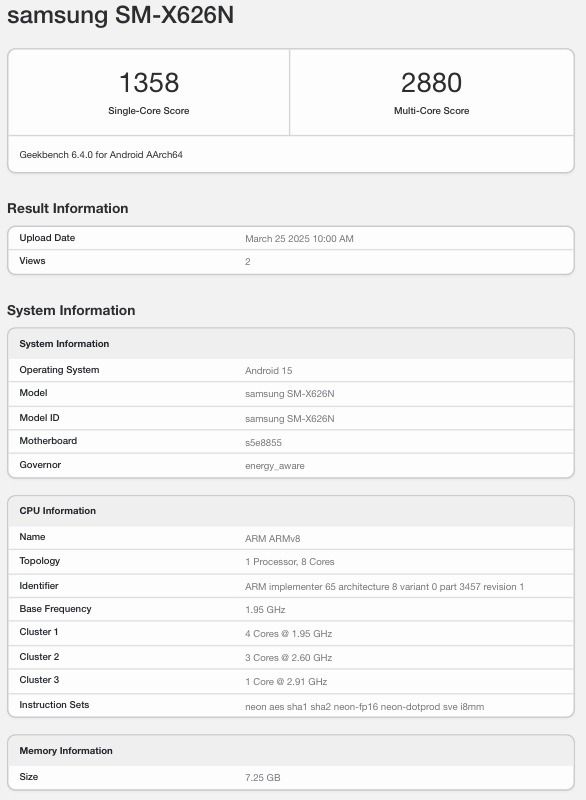 Igeekphone March 26 news, science and technology media xpertpick published a blog post yesterday (March 25), reported that Samsung Galaxy Tab S10 FE+ tablet appeared in the GeekBench running library, 6.4.0 version single-core score of 1358 points, A multi-core score of 2880.