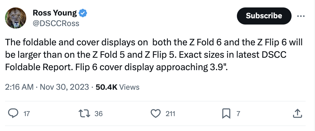 Igeekphone November 30 news, digital blogger Ross Young posted a post on the X platform today, claiming that Samsung will increase the screen size of its Galaxy Z series folding screen mobile phones next year, he did not provide the size of the Galaxy Z Fold6, However, it is claimed that the Galaxy Z Flip6’s secondary screen size will be expanded to 3.9 inches.