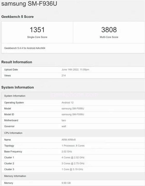 Samsung’s folding flagship Galaxy Z Fold 4 recently appeared in the GeekBench benchmark library. The test machine model is “SM-F936U”, which is the US version of the Galaxy Z Fold 4.