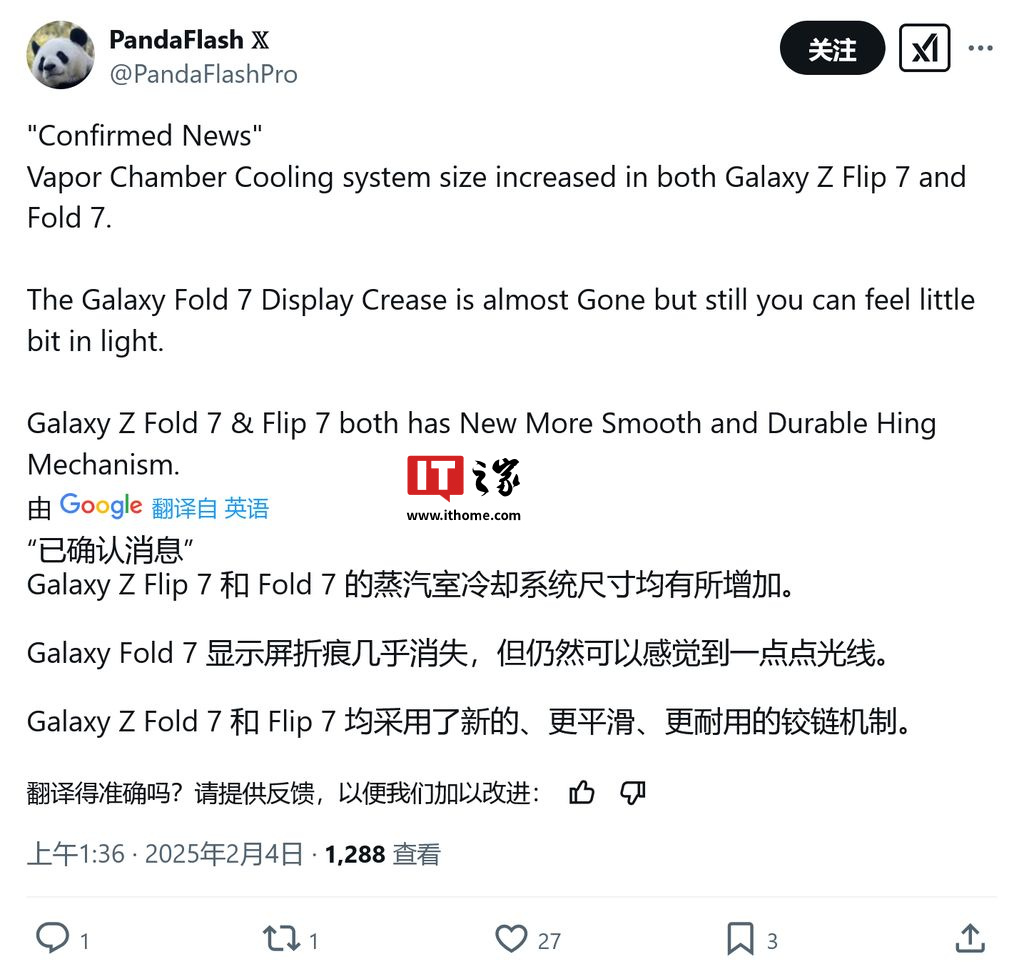 Igeekphone, February 5 news, news source @PandaFlashPro tweeted yesterday (February 4) on the X platform, revealing that Samsung has greatly optimized the screen crease of the Galaxy Z Fold7 folding phone, which is almost invisible, and only when adjusting the Angle of light, you can see a slight crease.