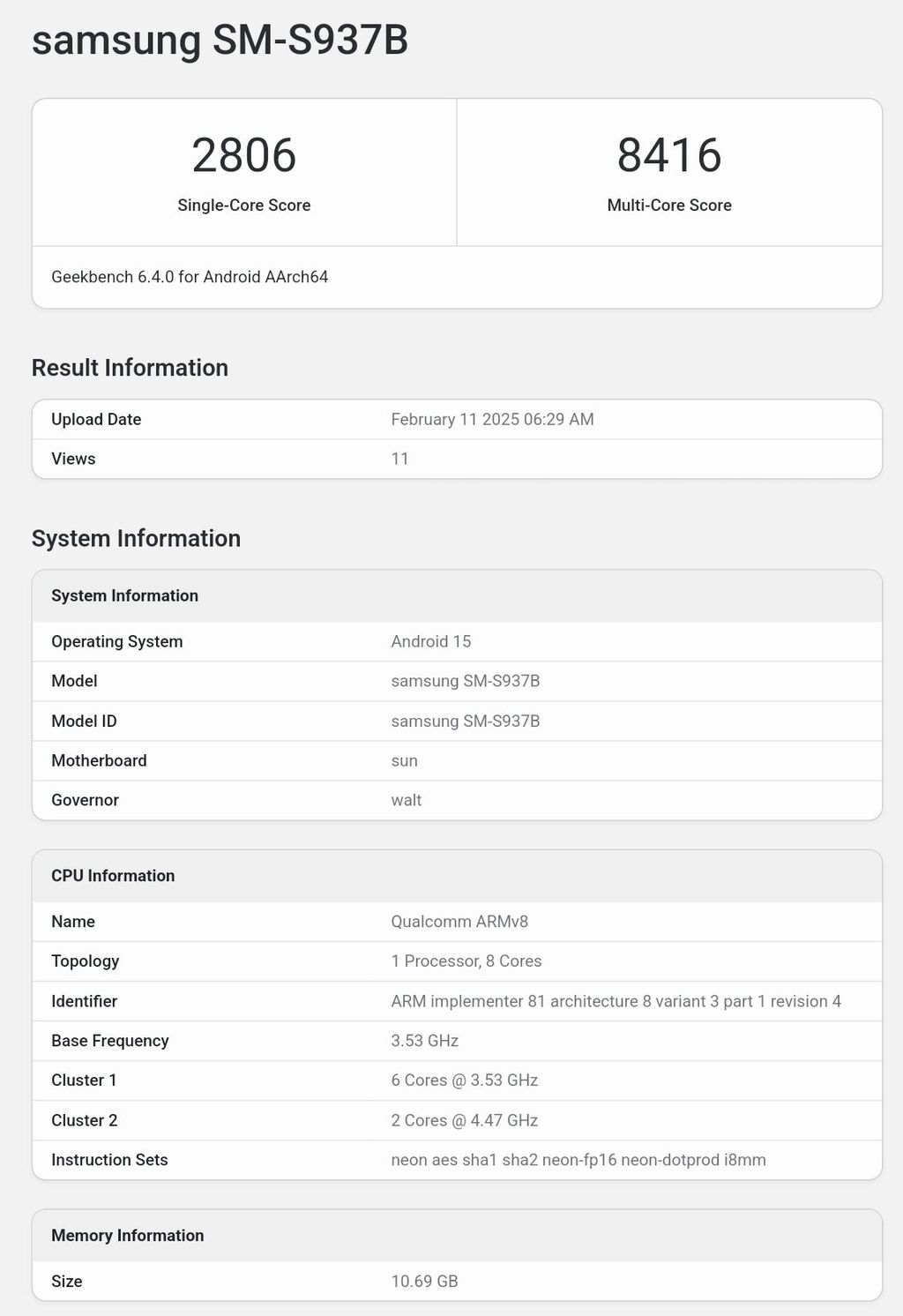 Igeekphone, February 12 news, Samsung’s thinnest flagship Galaxy S25 Edge mobile phone yesterday (February 11) appeared in the GeekBench run library, 6.4.0 single-core score of 2806 points, multi-core score of 8416 points.