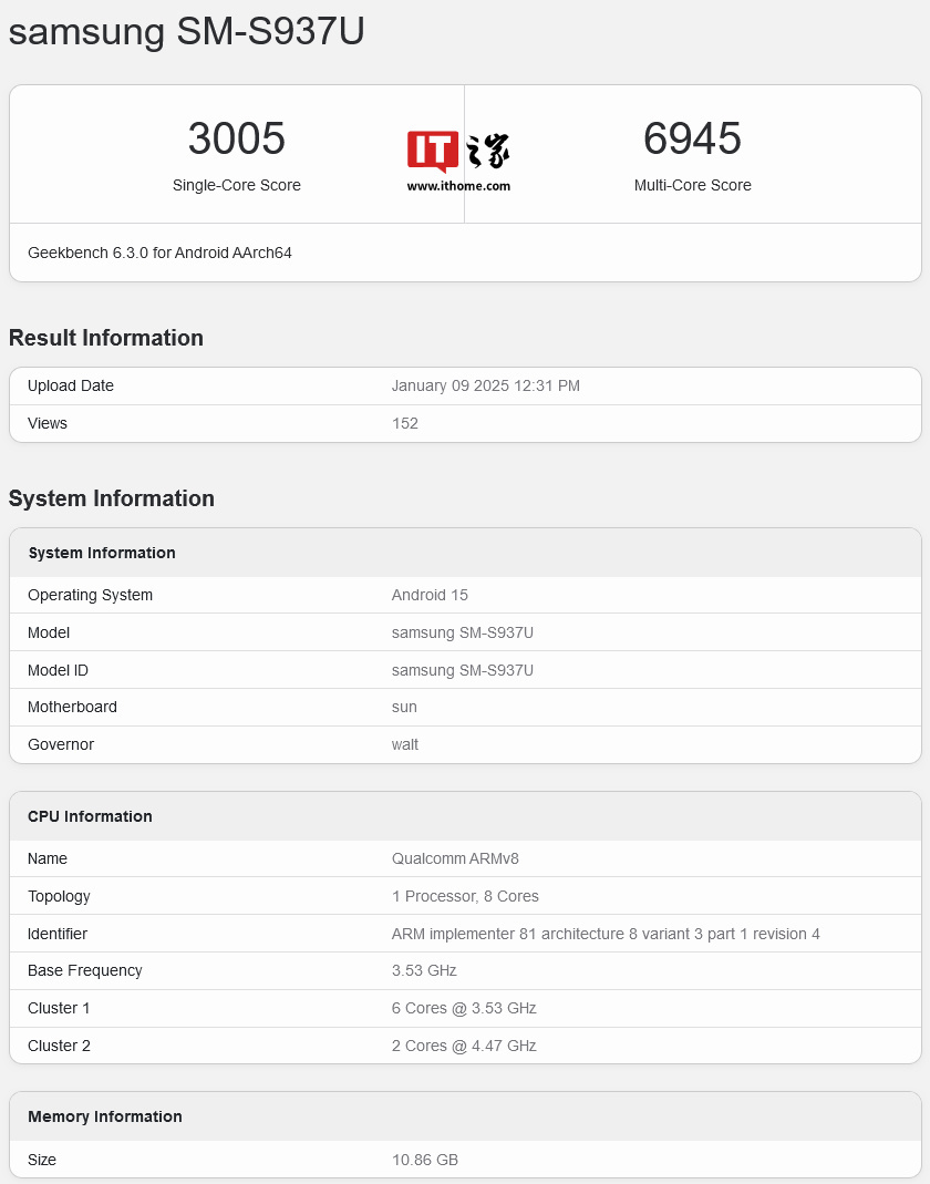 Igeekphone January 10 news, Samsung Galaxy S25 Slim mobile phone yesterday (January 9) appeared in the GeekBench run library, the model is “SM-937U”, 6.3.0 version single-core score of 3005 points, multi-core score of 6945 points.