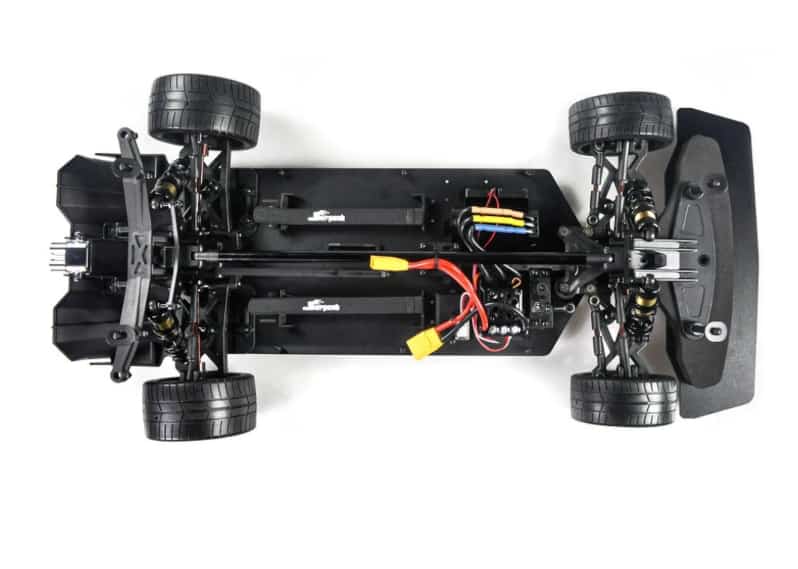 • Two Differentials: The car is equipped with two differentials (likely a gear diff in the front and a solid spool in the rear, common in drift setups). This configuration allows the wheels to rotate at different speeds through corners, providing the necessary grip and slip to initiate and maintain perfect drifts.