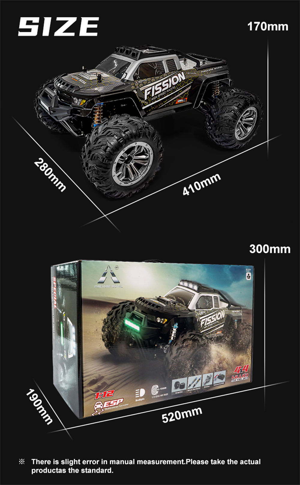 With a 2.4G full-proportion synchronization remote control system, the car ensures precise control over a distance of 100 meters. The inclusion of a 6kg steering servo further refines its handling capabilities. The ESP body electronic stabilization system (gyroscope) is a standout feature, providing exceptional stability and control at high speeds.