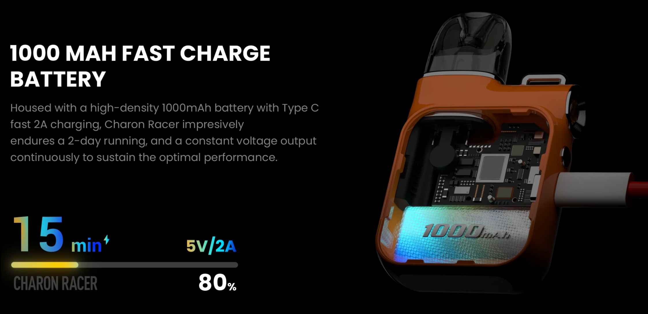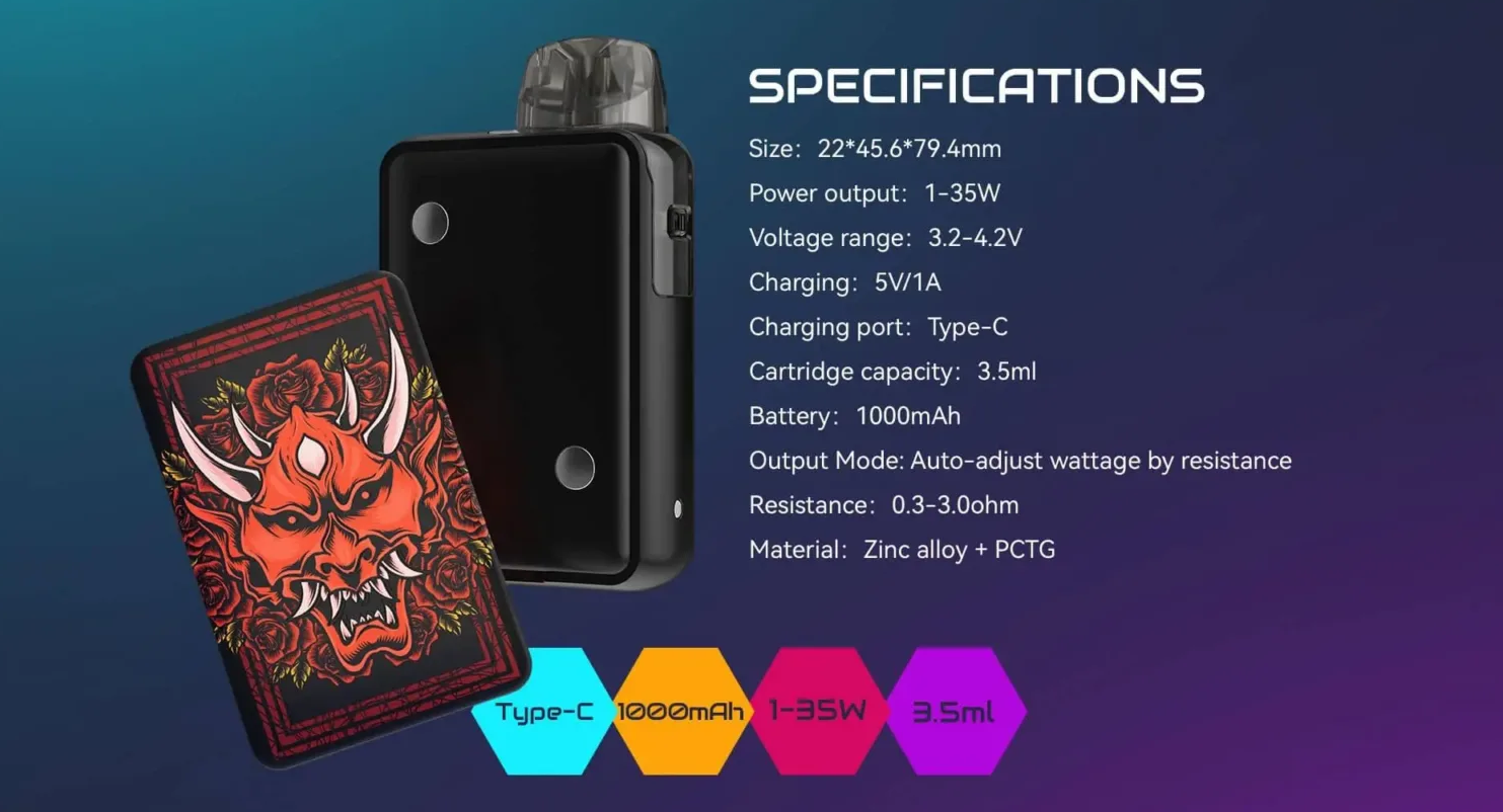 The Charon Racer-A is equipped with a 0.96″ TFT color screen that displays essential information in real-time, enhanced by various UI animations. This device offers a smart adjustable power system with a power range of 5-45W, allowing users to customize their vaping experience. It features three levels of airflow control and is compatible with new mesh coils (0.4/0.6/0.8 ohms), providing pure flavor and lingering aftertaste. The Charon Racer-A also includes a Type-C charging port, facilitating faster and more efficient charging with a current of 5V/2A.