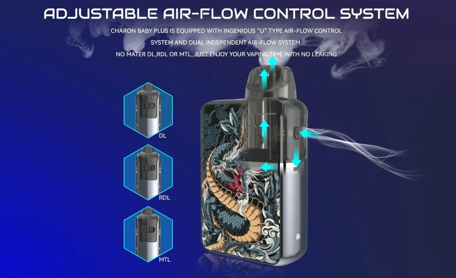 The Charon Racer-A, with its motorcycle-inspired design and robust feature set, appeals to enthusiasts looking for a device that combines aesthetics with advanced functionality. Its adjustable power system, comprehensive screen, and airflow control offer a highly customizable vaping experience.