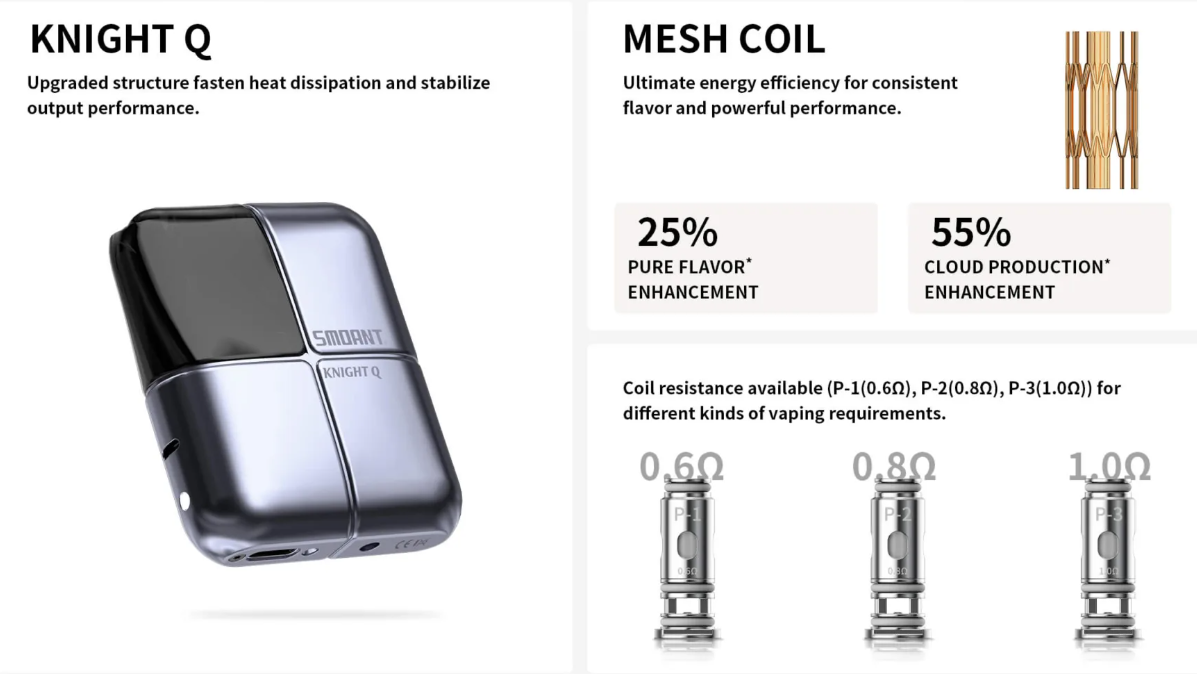 The Smoant Knight Q utilizes a range of innovative technologies, such as the AI Smart Ant-chip, which enhances the overall vaping experience. The kit supports both sub-ohm and regular coils, catering to different vaping preferences.