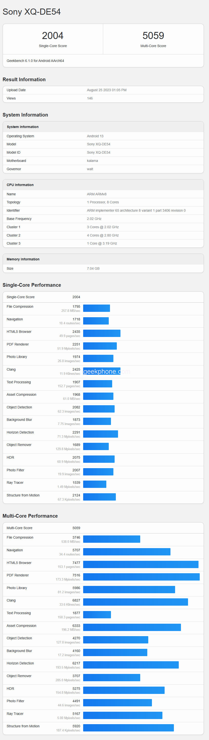 As indicated by the Geekbench findings, the Xperia 5 V (XQ-DE54) derives its power from a 3.19GHz Qualcomm Snapdragon 8 Gen 2 processor. Accompanied by 8GB of RAM, it comes pre-installed with an Android 13-based operating system.
