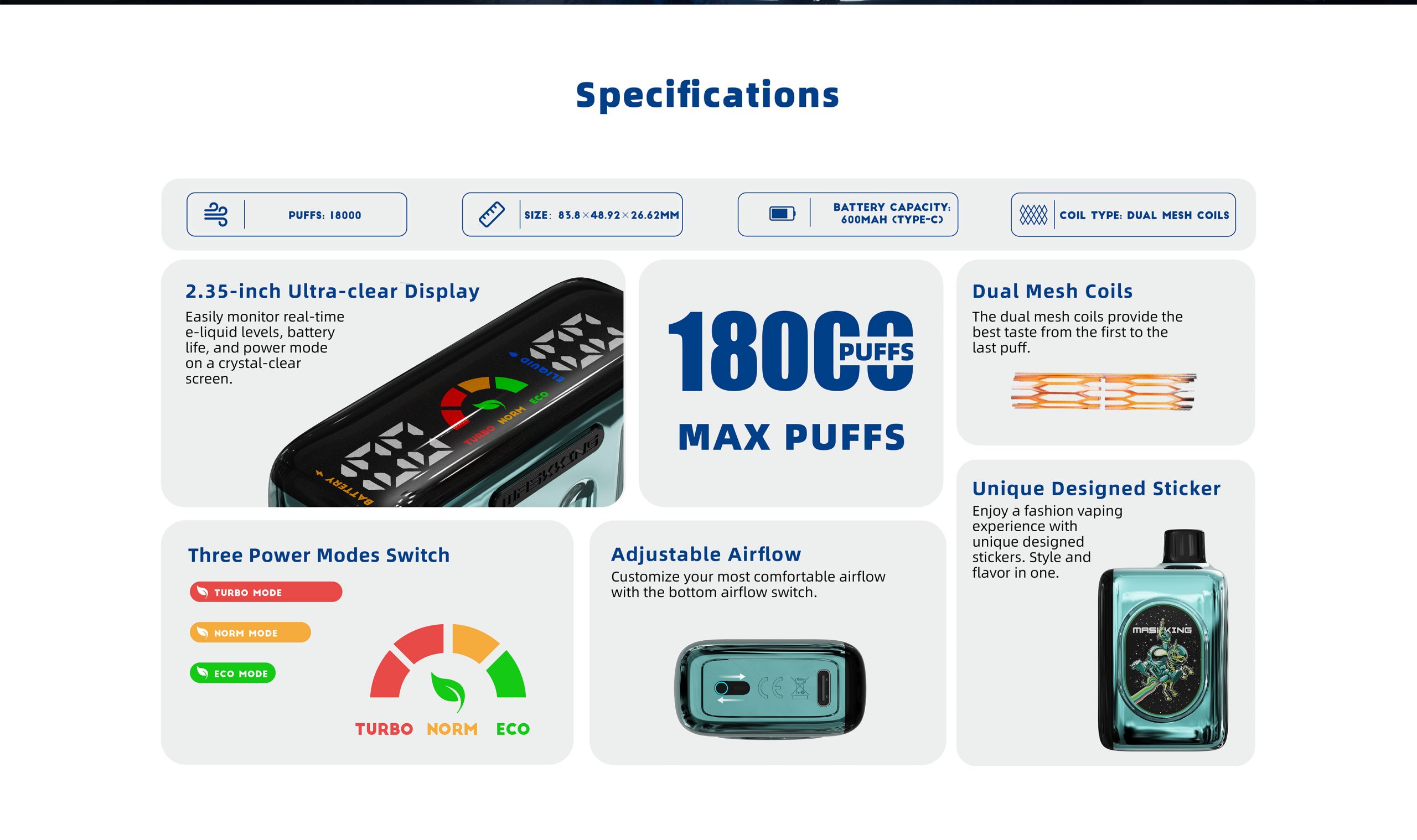 Similarly, the Maskking Roki X 18000 also delivers up to 18,000 puffs, making it equally suitable for users who prefer long-lasting devices. Its advanced engineering supports consistent vapor production throughout the device’s lifespan. For users seeking endurance and reliability, both devices perform at a high level.