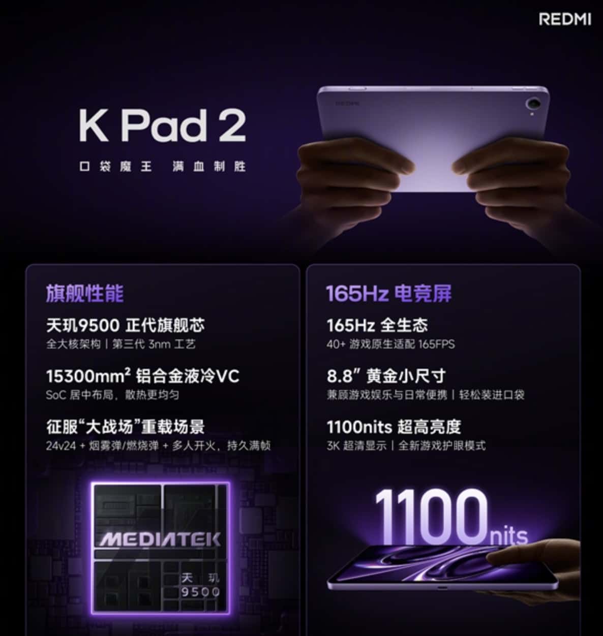 REDMI K Pad 2 maintains the same design as its predecessor. It features an 8.8-inch 3K LCD flagship screen with a 165Hz high refresh rate and a peak brightness of 1100 nits. It is the first to support 40+ games including “Delta” with native high frame rates.