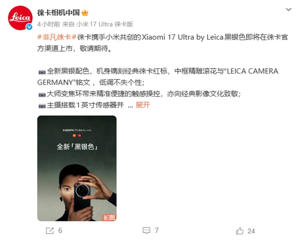 Today, the official WeChat account of Leica Camera China announced that the black and silver version of Xiaomi 17 Ultra by Leica, jointly created with Xiaomi, will be available for purchase on Leica’s official channels in the near future.