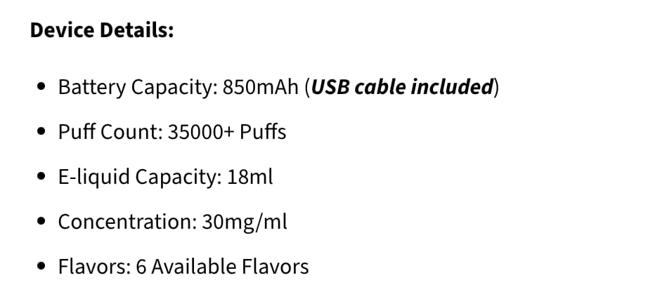 The nicotine concentration is 30mg/ml, with a nominal maximum aspiration of 35,000 puffs