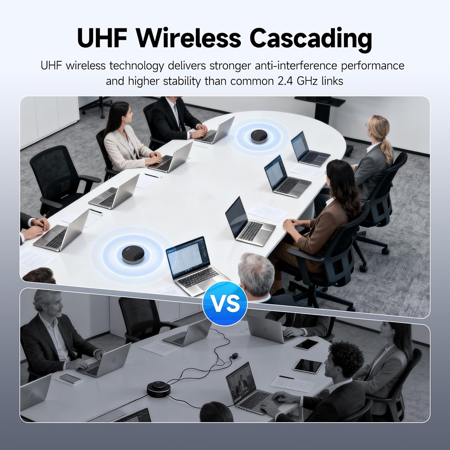 For larger setups, the wireless daisy chain capability allows multiple units to connect seamlessly, extending coverage up to 10 meters between devices. This makes it ideal for both small teams and larger conference rooms.