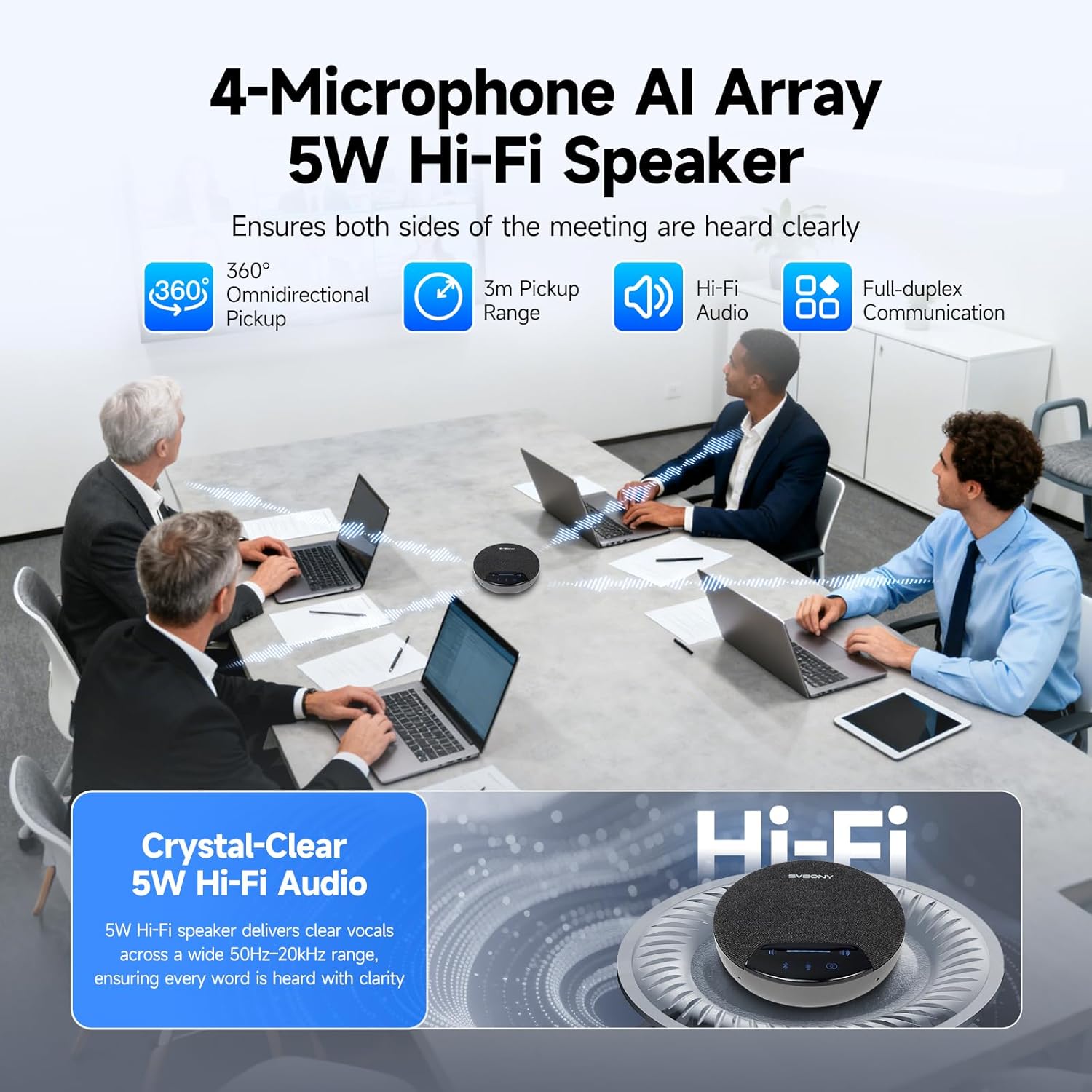 The 360° four-microphone array captures sound from every direction within a 3-meter radius, making it perfect for group discussions. No more repeating yourself or worrying about being unheard during meetings.
