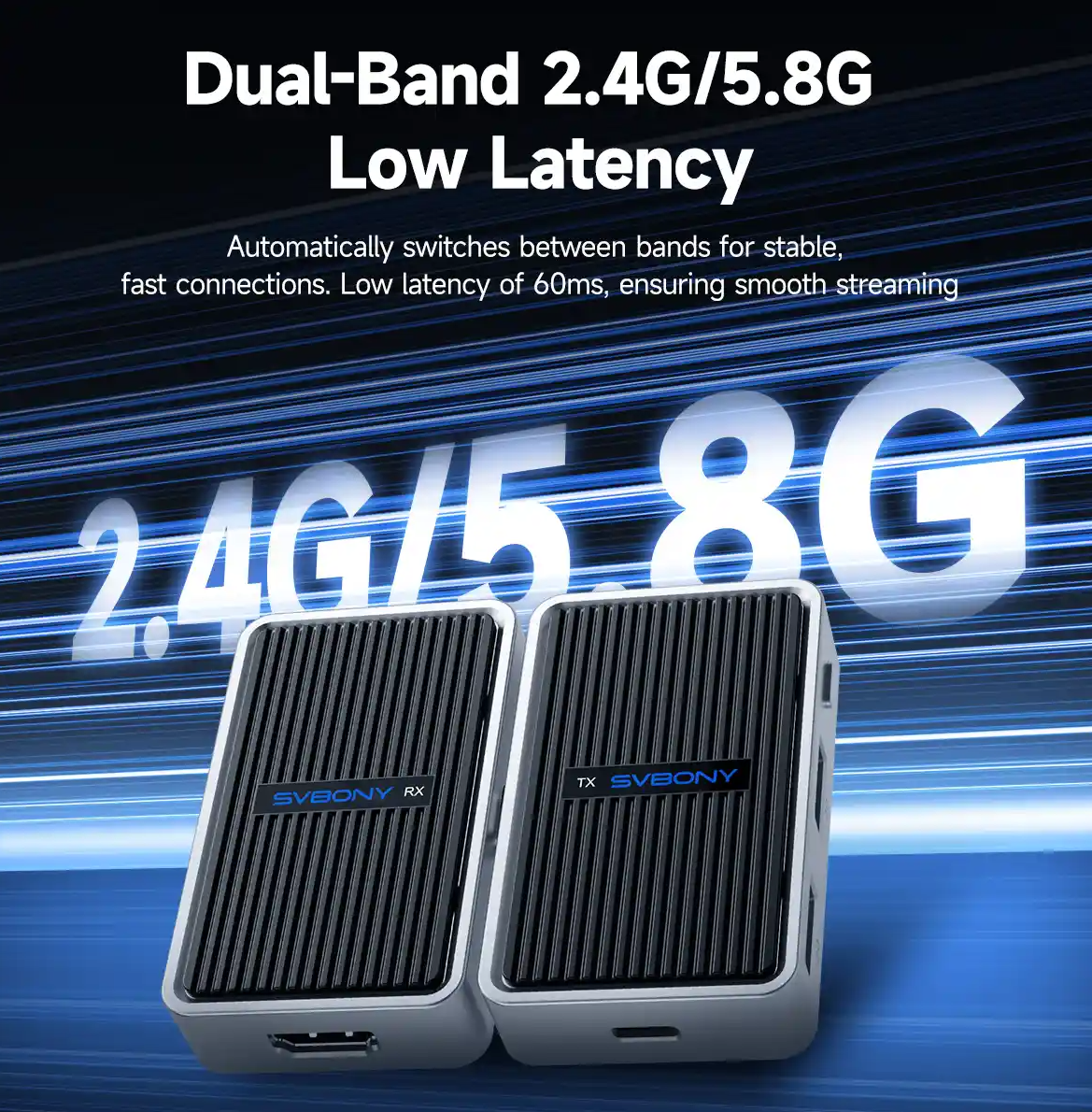 It uses dual-band 2.4GHz and 5.8GHz transmission, automatically switching between frequencies to maintain a fast, low-latency connection. This reduces lag and interference, which is especially important for presentations or video playback.