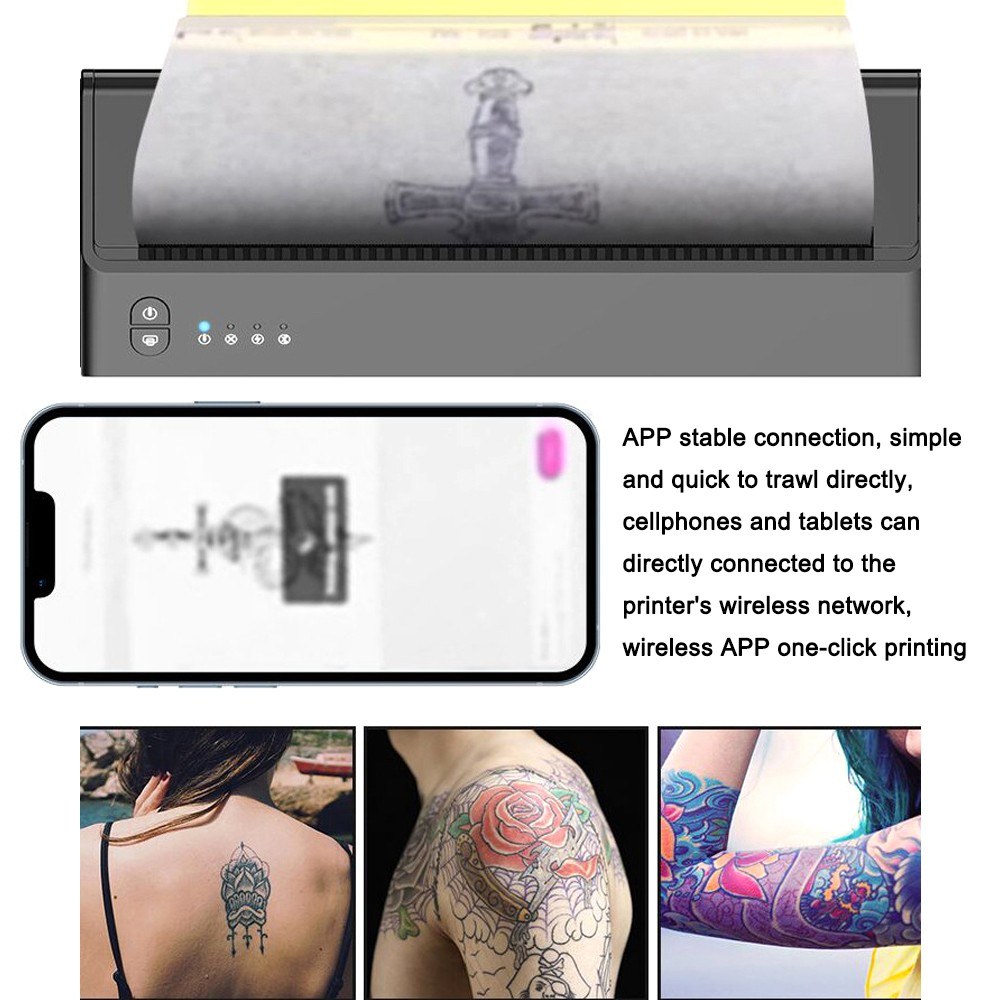 The tattoos printer is a state-of-the-art device that can easily and quickly copy designs onto transfer papers. The transfer printing is clear and beautiful, effectively keeping the paper neat and not easy to fade. It is simple and fast to use, saving time and effort, as no manual drawing is required. With 4 indicator lights, the working states are clear at a glance. The printer has a stable wireless APP connection, making it simple and quick to trawl directly. Cellphones and tablets can easily connect to the printer’s wireless network, enabling one-click printing. The printer has a BT+USB print interface design, with a BT connection and no ink or toner needed.