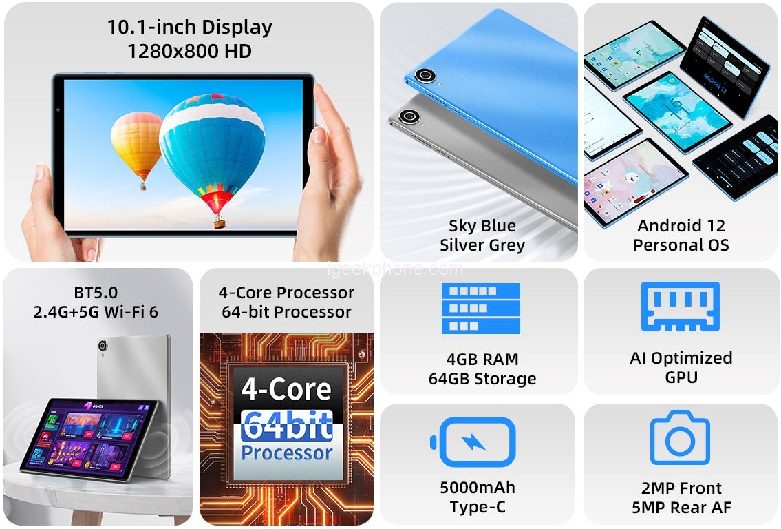 The Teclast P25T is a tablet that boasts of stunning design and exceptional display quality. This device is available in two beautiful finishes – a vibrant sky blue and a calming silver grey – that perfectly complement its sleek and modern design. With a 10.1-inch, 1280×800 HD resolution IPS display; the P25T delivers an immersive and enjoyable viewing experience for movies, games, and videos. Its 178° wide-viewing angle ensures that you can view content from any angle without losing clarity. The P25T is also lightweight, weighing just 543g, and has a compact size of 245×153.3×10.8 MM, making it easy to carry around and use on the go.