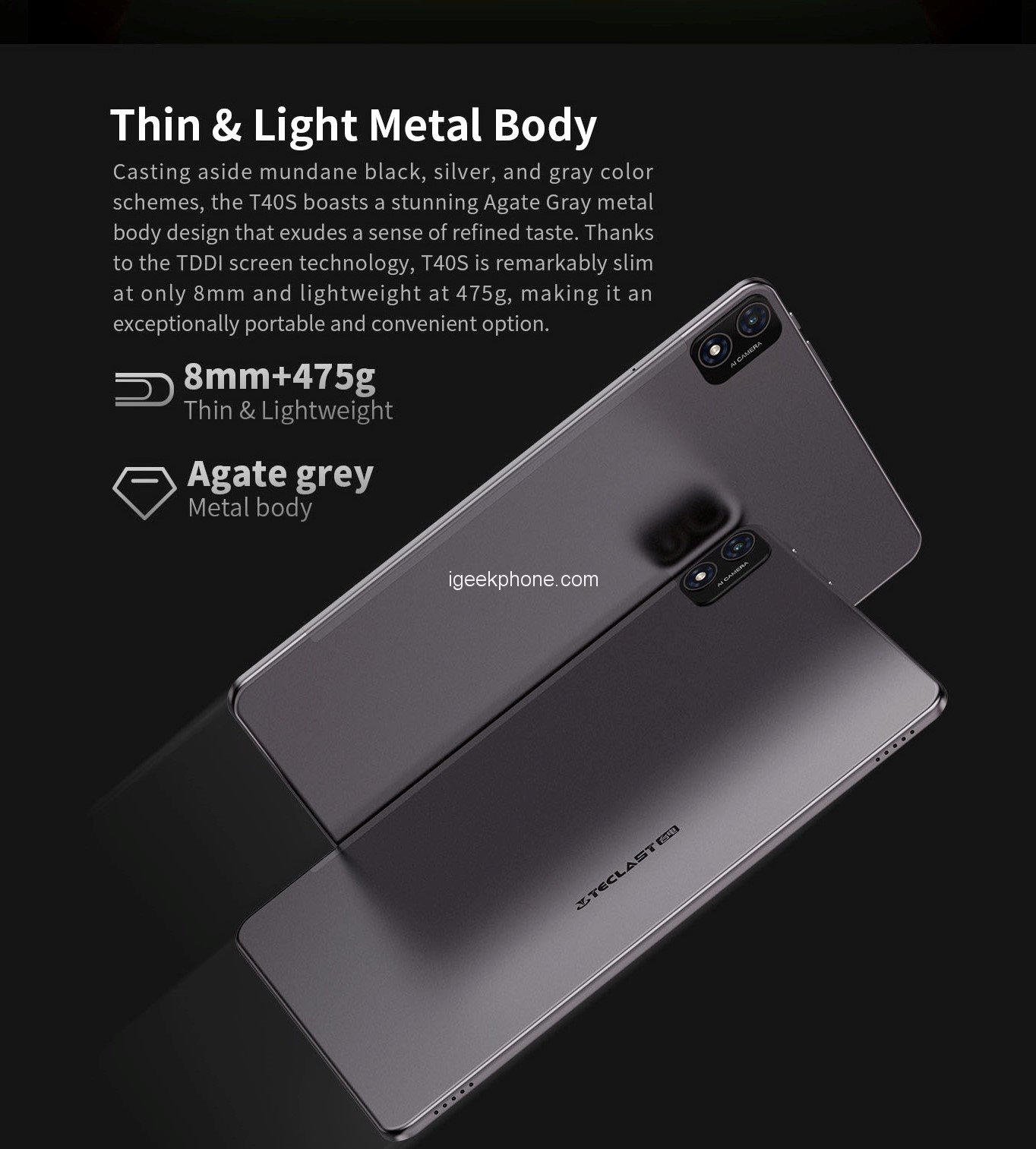 Equipped with a 10.4-inch IPS capacitive screen, the Teclast T40S delivers vibrant and immersive visuals. The display features a resolution of 2000*1200, offering crisp and sharp image quality. Whether you are watching movies, playing games, or browsing the web, the T40S’s display produces accurate colors and wide viewing angles, enhancing the overall visual experience.
