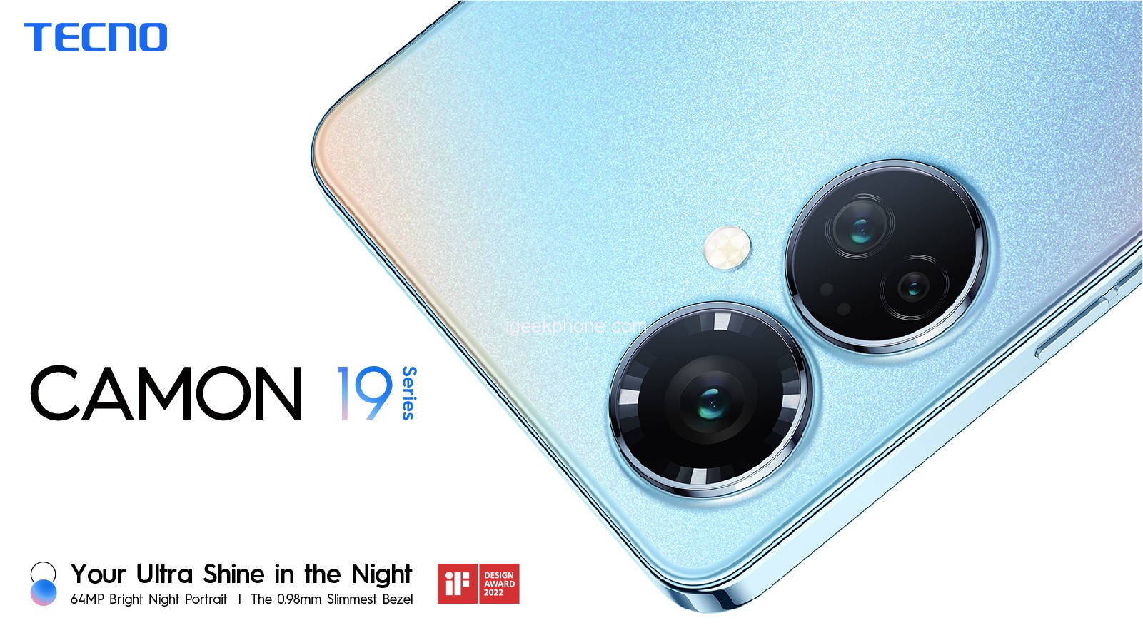 The fashion-forward Camon 19 Pro has made its name well known in the design segment as a winner of the IF Design Award for its 0.98mm Slimmest Bezel. The dazzling back shell hosts 200 million stars-like particles giving a feel of the bright starry sky. This straight-frame and trendy design smartphone with a delicate touch, non-stick fingerprints, and premium texture give a premium look.