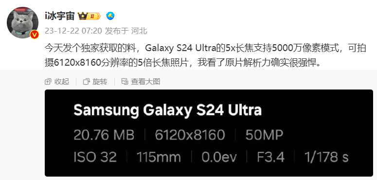 Igeekphone December 22 news, according to the blogger @i ice Universe today broke the news that the Galaxy S24 Ultra phone’s 5X telephoto support 50 million pixels mode, can shoot 6120×8160 resolution 5x telephoto photos, the original film resolution is “very strong”.