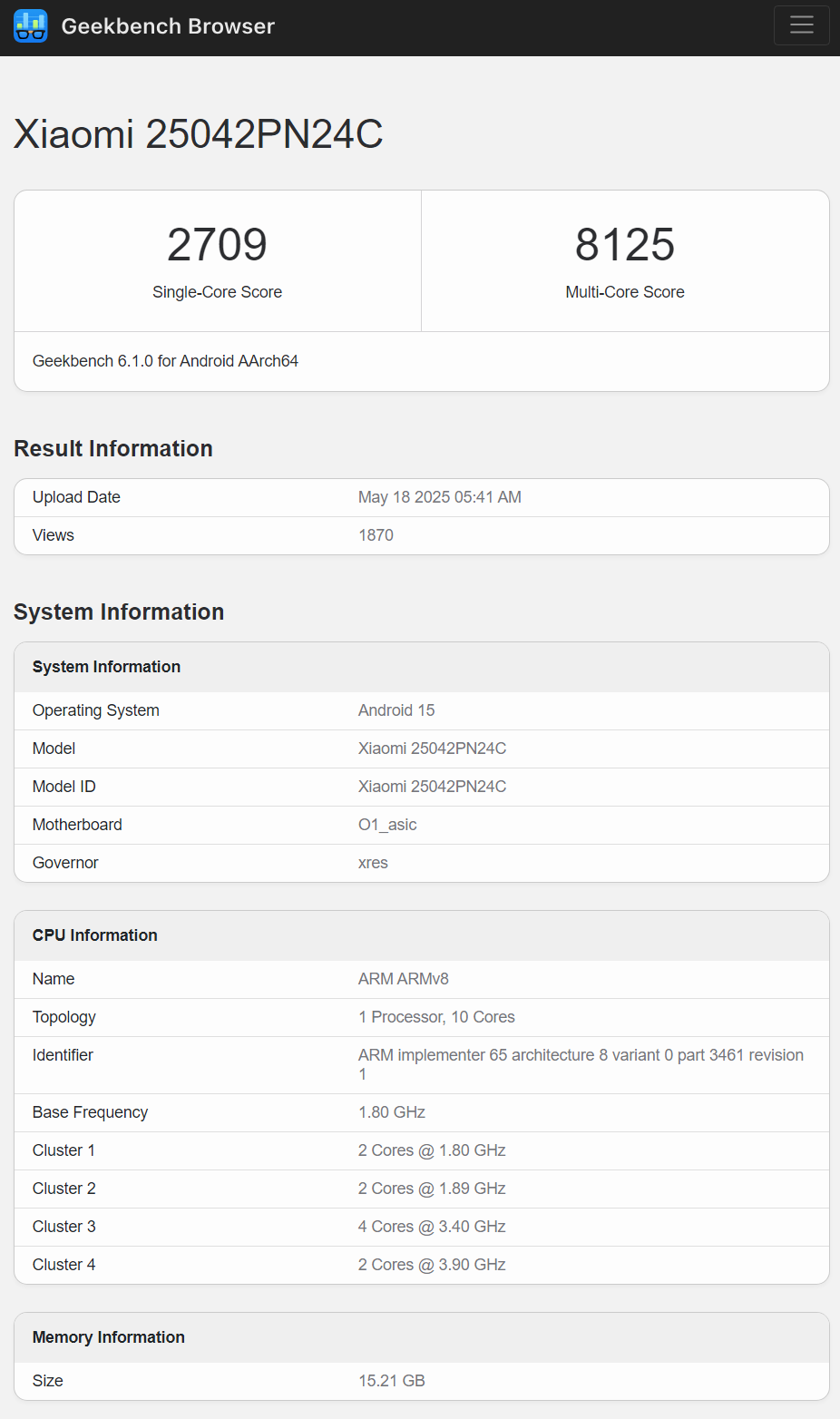 Currently, the new “Xiaomi 25042PN24C” device has appeared on the Geekbench 6.1.0 benchmarking platform. Its highest single-core score is 2709, and its multi-core score is 8125, which is even higher than the performance of the Qualcomm Snapdragon 8 Gen3. It supports UWB and 90W fast charging. The benchmark scores show that the motherboard information of this device is displayed as “O1_asic”, which is suspected to be the self-developed Xuanjie O1 chip that Xiaomi is about to launch.