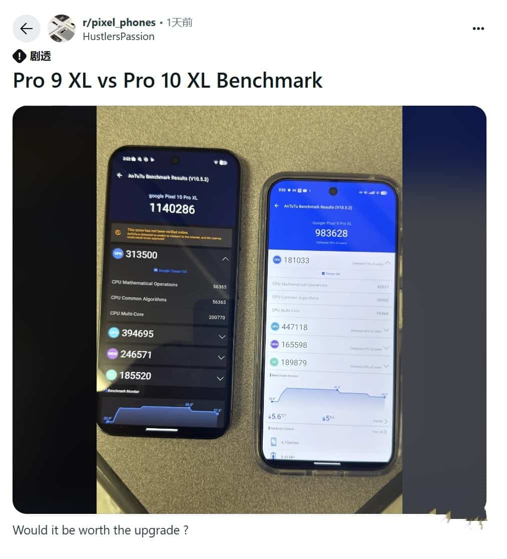 According to the information on the Antutu Benchmark library page, the comprehensive score of the Pixel 10 Pro XL is 1,140,286 points. Compared with the 983,628 points of the Pixel 9 Pro XL, its overall performance has improved by 15.93%.