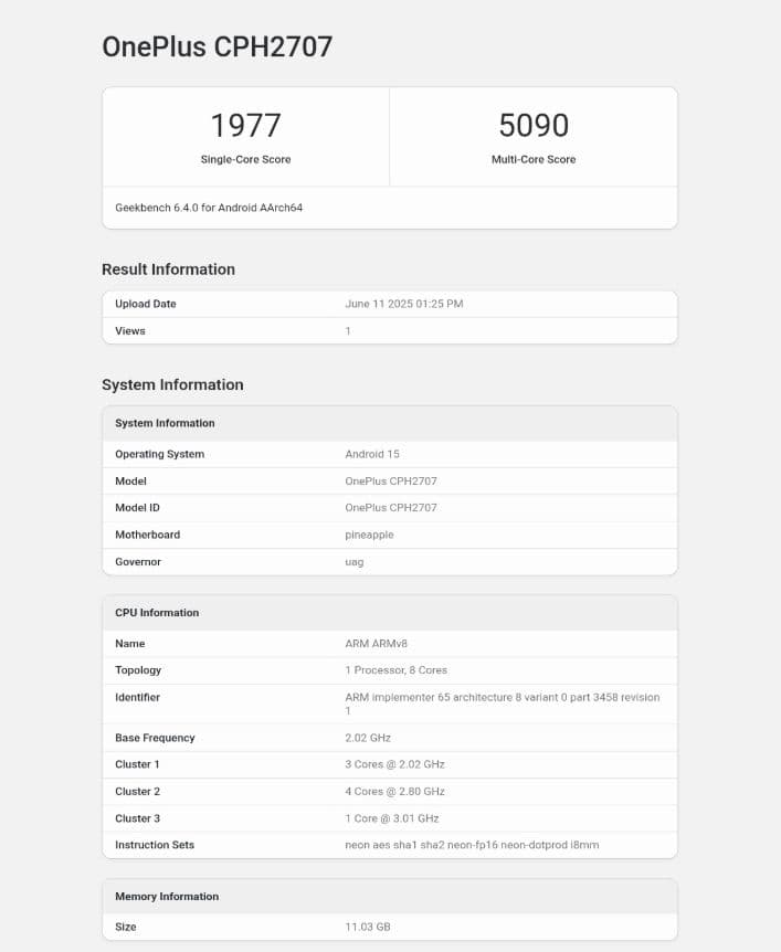 The model that appeared in the benchmarking database this time is CPH2707. According to the information previously displayed in the GSMA IMEI database, it is the Indian version of the OnePlus Nord 5 mobile phone.