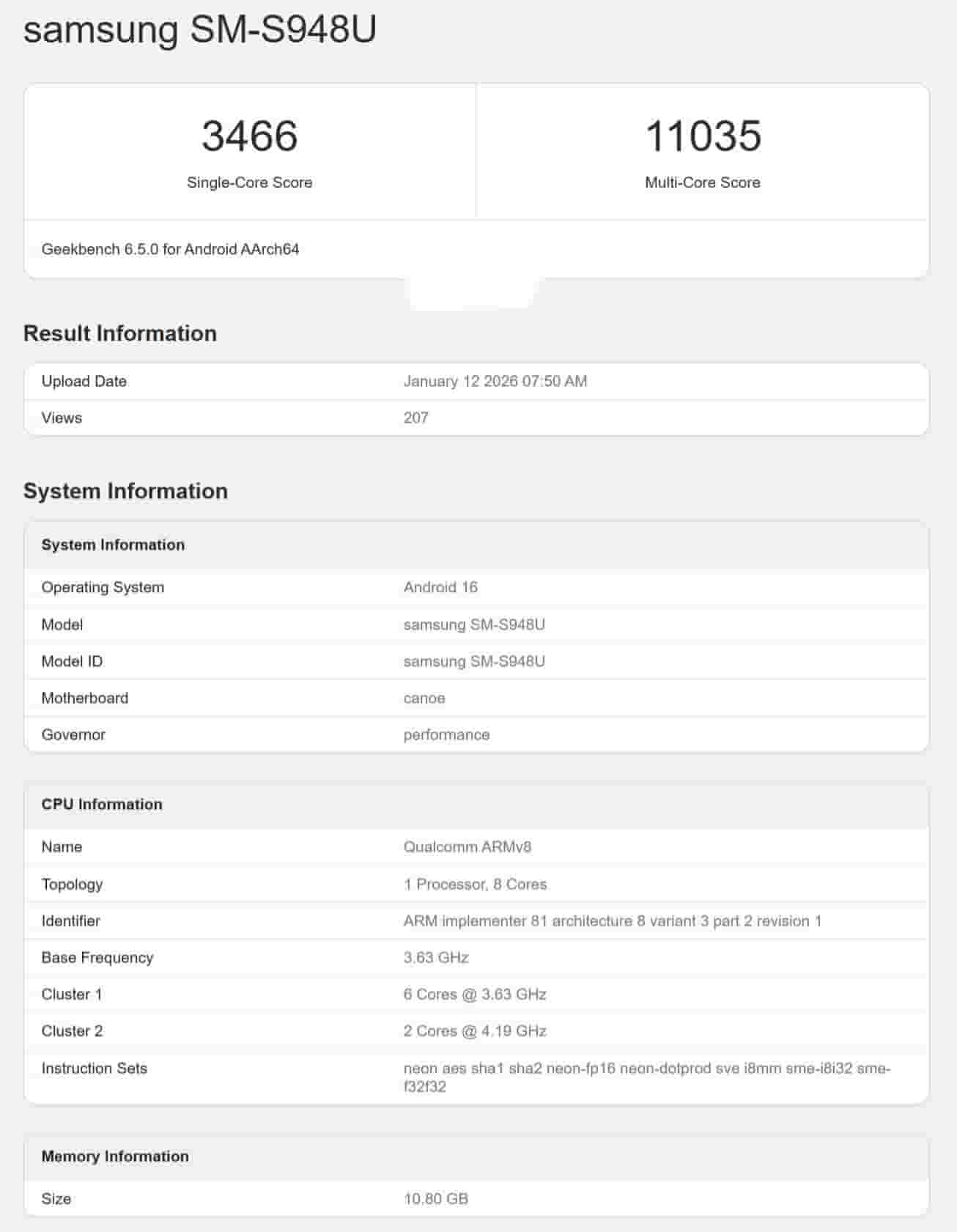 IGEEKPHONE reported on January 13th that the technology media Wccftech posted a blog post yesterday (January 12th) stating that a Samsung mobile phone with the model number SM-S948U was found in the GeekBench score database. Its single-core score in version 6.5.0 was 3466 points, and the multi-core score was 11035 points. According to the previous GSMA IMEI database information, this model was named Galaxy S26 Ultra after its launch.