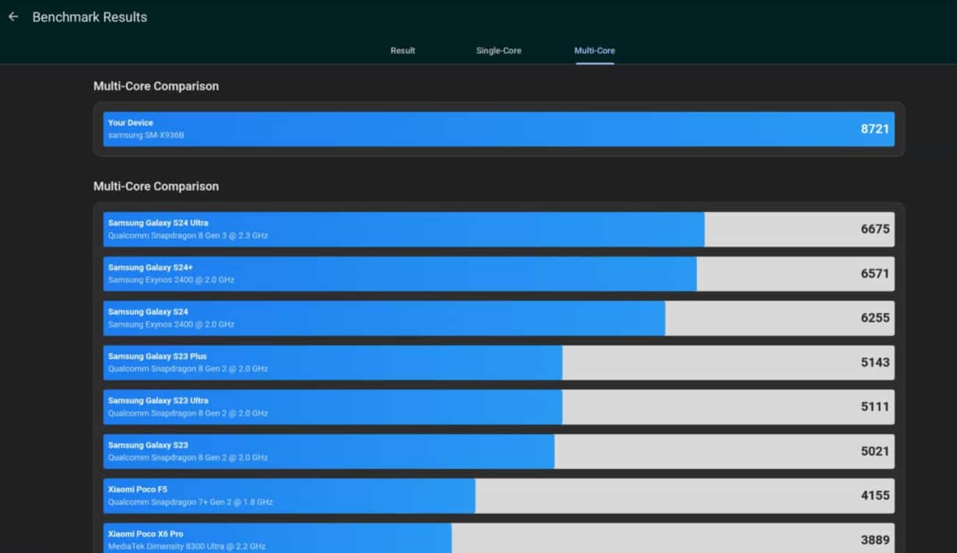 According to the GeekBench version 6.4.0 results, the single-core score of this tablet is 2474 and the multi-core score is 8721. Compared with the S10 Ultra equipped with the Dimensity 9300+ (2111 single-core and 7319 multi-core), the single-core performance has improved by 17.2% and the multi-core performance by 19.16%.