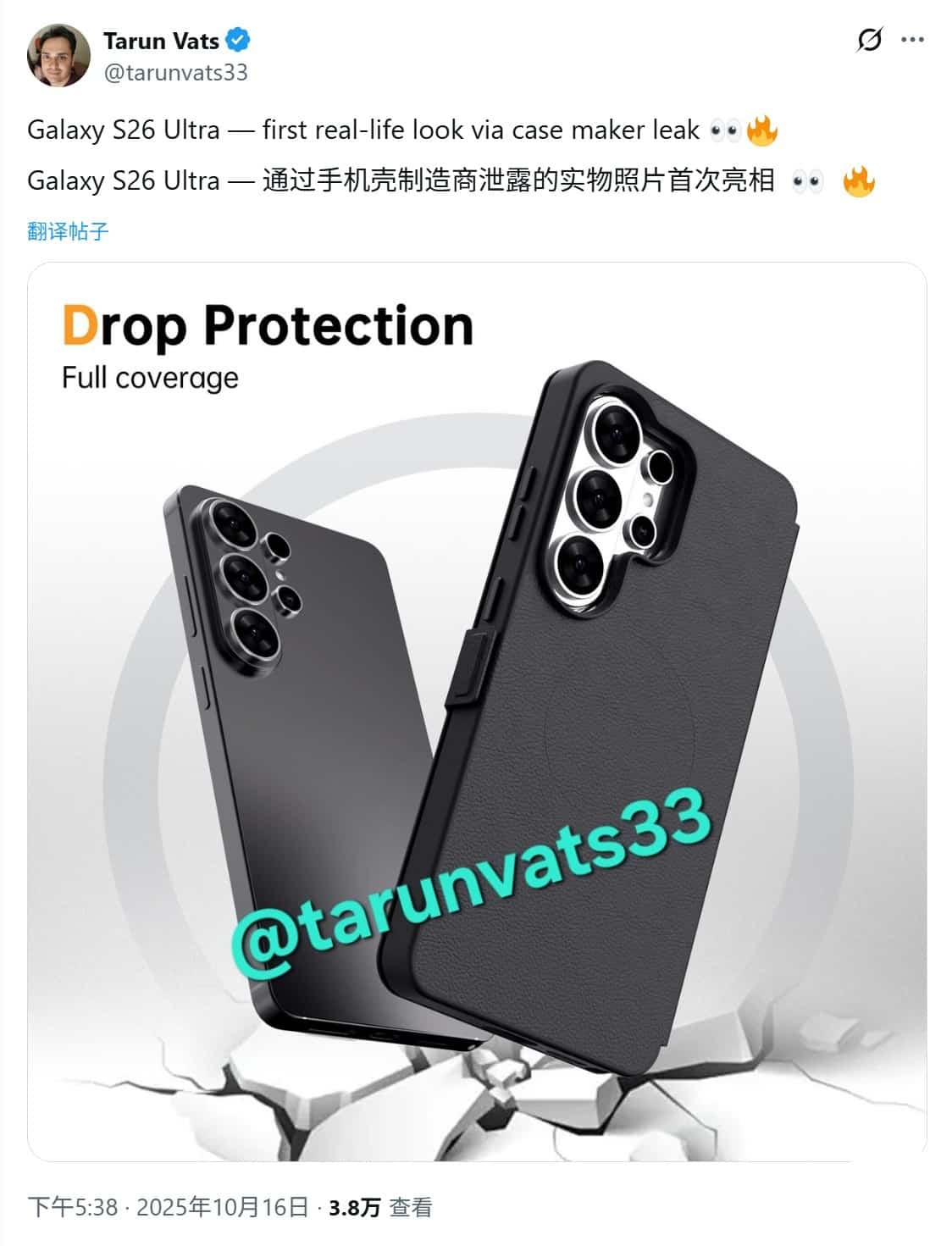 Igeekphone News, October 17th: The source @tarunvats33 posted a tweet on the X platform yesterday (October 16th), sharing a picture from a phone case accessory manufacturer that showcases the appearance of the Samsung Galaxy S26 Ultra. The overall design has not changed much compared to the previous generation. The main adjustments are focused on the rear camera module.