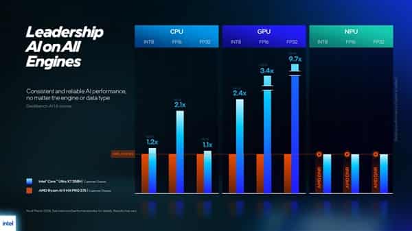 In terms of competitive benchmarking, Intel compared it with AMD Ryzen AI 9 HX PRO 375. Taking the Core Ultra X7 358H as an example, the photo editing performance was 1% ahead, the web application performance was 8% ahead, the general office performance was 33% ahead, the video editing performance was 58% ahead, and the AI performance was 149% ahead.