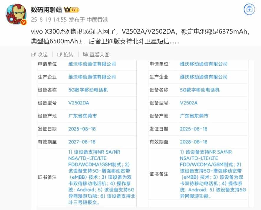 Igeekphone News, August 19th: Blogger @Digital Chat Station shared today that the new vivo X300 series models have obtained dual license for network access. The models are V2502A and V2502DA, both with a rated battery capacity of 6375mAh (typical value: 6500mAh±). The latter’s Weitong version supports Beidou satellite SMS.