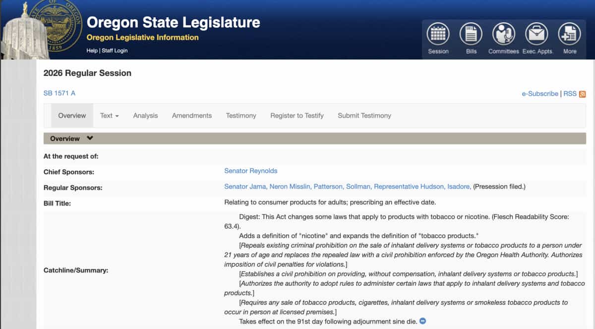 According to the Oregon Capital Chronicle, the Oregon Senate passed Senate Bill 1571 (Senate Bill 1571) by a vote of 26 to 1, aiming to fill the regulatory gap in the state law regarding nicotine pouch products.