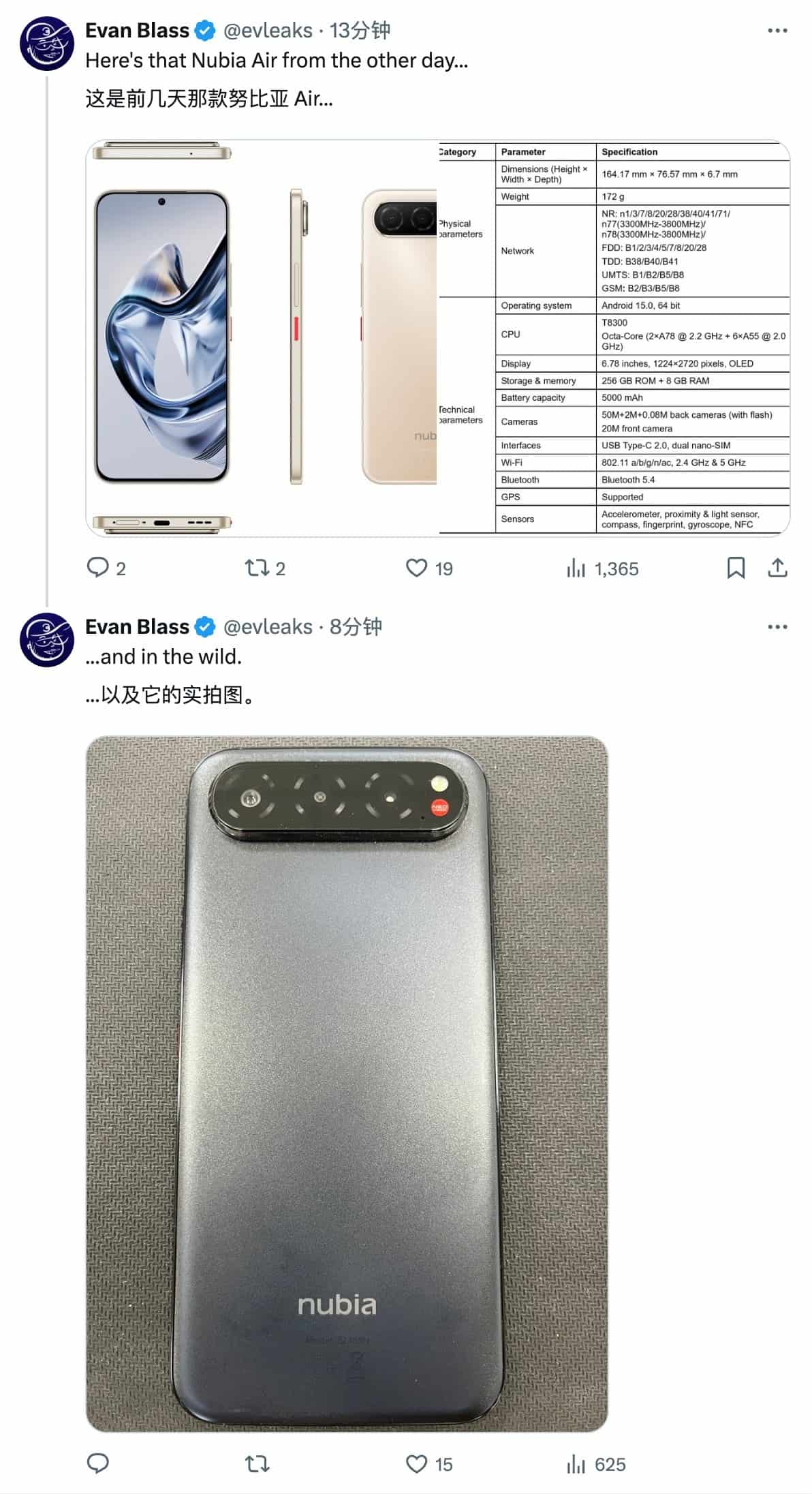 Igeekphone News, August 8th: This morning, the leaker Evan Blass released more information about Nubia’s new slim and light phone, Nubia Air, on the X platform, including renderings, parameter information, and real machine pictures, making this phone fully visible.