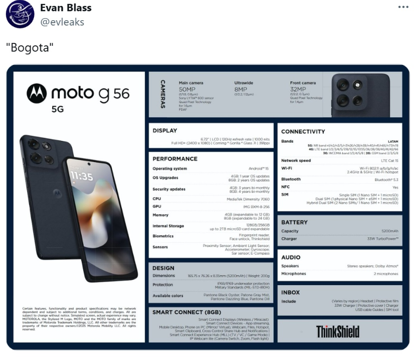 Igeekphone News, May 16th: Technology media nieuwemobiel published a blog post yesterday (May 15th), once again sharing the high-definition renderings of the MOTOROLA Moto G56 5G mobile phone and revealing all-round pictures in blue, green and black.